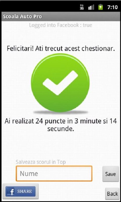 - Have the option of posting on FACEBOOK score achieved to keep yourself updated with the results of your social life (facebook application must be accepted Auto School)