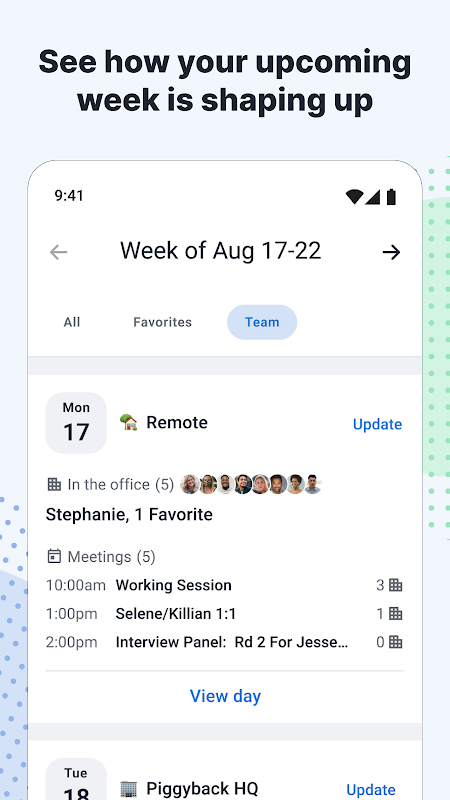 Get a quick rundown of your work week, including your upcoming meetings and co-workers’ office plans.