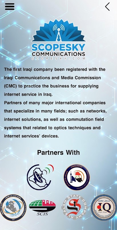 ScopeSky Communications is the First Iraqi Company signed a partnership contract with Iraqi Telecommunications and Post Company ITPC, which is one of Ministry of Communications companies, to obtain the first license to provide internet service via fiber optic cables in all provinces and cities in Iraq and linking Iraq with neighboring countries.