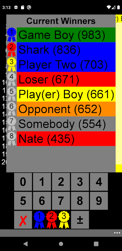 ScorePad is a generic scorekeeping app that calculates a total from a list of scores. Settings can be used to specify whether negative scores are allowed, whether to display round numbers, whether the winner is determined by the highest or lowest score, and what format should be used to display the scores. Names & settings can be changed, added, removed, and/or reordered at any time without resetting the scores, and a new game can be started with the same players & settings without the need to go to the settings page. A list of the current total scores sorted by who is in first, second, third, etc. (based on the "Sort Scores in Reverse" option in the settings) can be displayed by holding the places button.