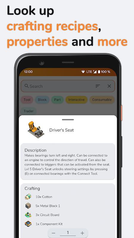 This Guide / Assistant is not associated with or authorized by Axolot Games. The names Scrap Mechanic and Axolot Games as well as related names, marks, emblems and images are registered trademarks of their respective owners. This app is made by fans for fans.