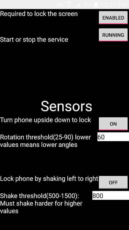 The angle and shaking thresholds can be set to suit your screen locking needs.