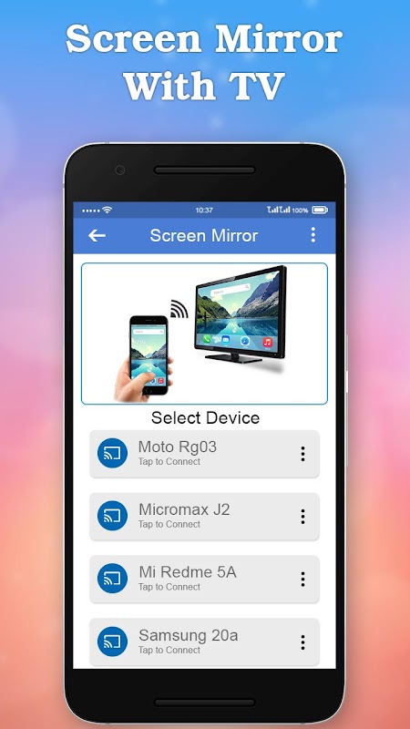Screen Mirroring with TV will help you to share, display and mirror your android phone or tab's screen on smart TV. Screen Mirroring with TV - Connect Mobile With TV can only play contents but send screen as is such as HDMI, MHL, Miracast and Chromecast. It has been tested and found works on most of android mobiles.