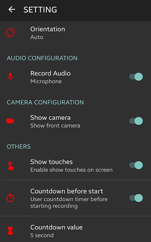 Configure the mobile recording parameters, it is not necessary to root the phone and risk failure with this application. Use "Countdown" to have a customizable margin for the seconds you need before the screen capture begins. Make video to your mobile, capture the screen, record your actions and share the screen. All free.