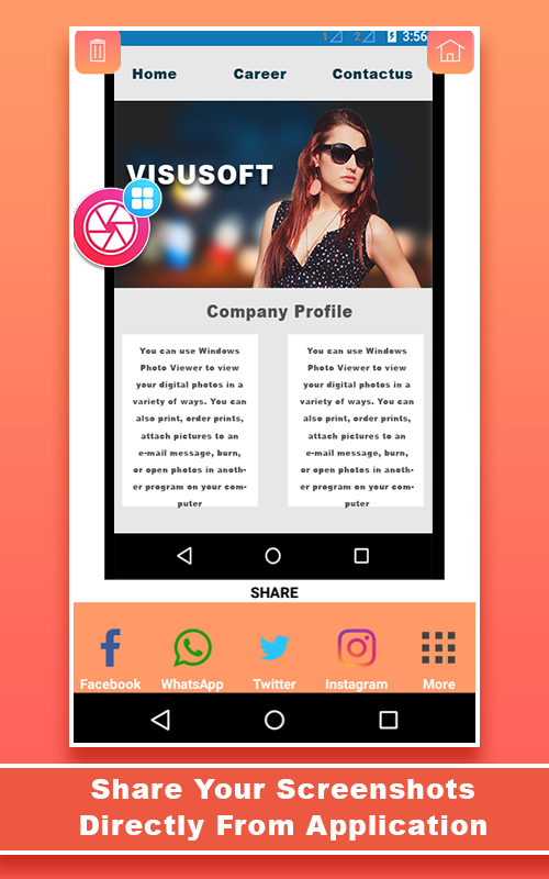 Screen Capture is the best,easiest and simplest way to capture, edit and share your mobile screen with friends and all. There is an "Overlay button" to capture screen that is displayed on top of everything. You can take the screenshot easily with one touch on the screen. Capture the screen in several apps such as games, wallpapers or any type of apps or videos. Floating button/gadget always remain on the top of the screen, so that you can capture easily at any time. Edit the captured image and share it with your friends in online platform.