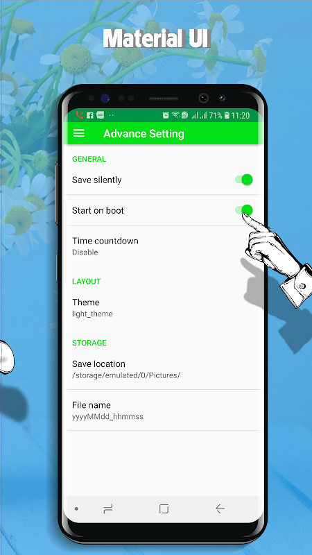 ✓ One touch on floating button, notification, camera button or shaking device to take screenshot