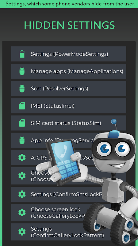 In your device, secret(hidden) codes are available. When those codes are typed manually from the phone dial, they will unlock a hidden menu with more options and information for your Android device. Now is not necessary to remember all those codes, they can be executed only with one finger tap! Enjoy and have a fun!