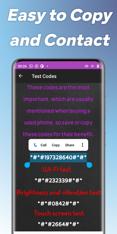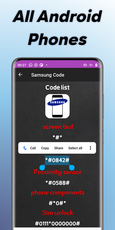 A secret codes application for all Android phones, through which you can obtain many codes that will benefit you in knowing the problems and repairing your phone, including a spy code ...