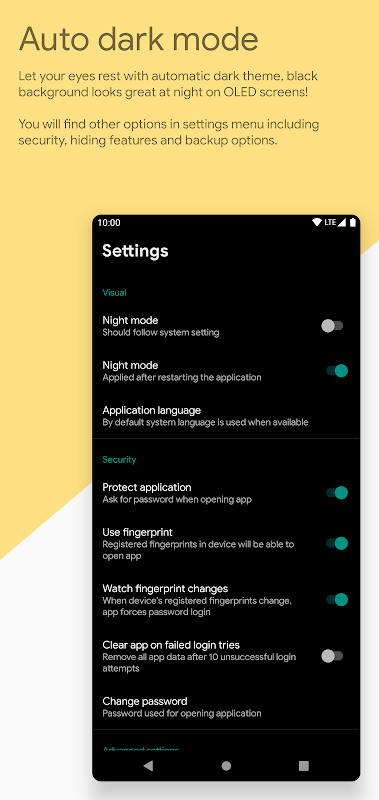 • Password and biometric login into app