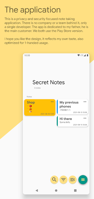 One day my father asked me if I know a good notes application with data encryption, so that he can store his private stuff in it and trust it. I said I know some, but if he wants, I can write one. This is what I did, but decided to share it. This is a hobby project but I use it also myself.