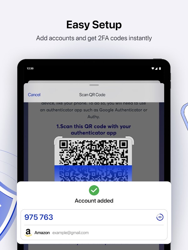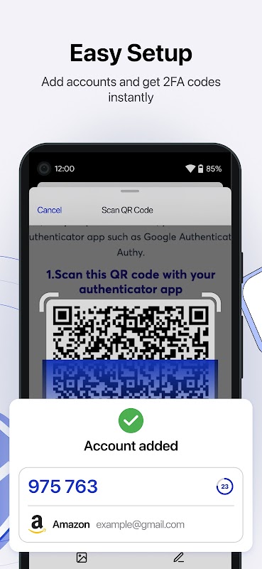 Set up 2FA easily by scanning a QR code or entering your account details manually. Whether you're setting up 2FA for Google, Microsoft, or Steam, the process is smooth and intuitive.