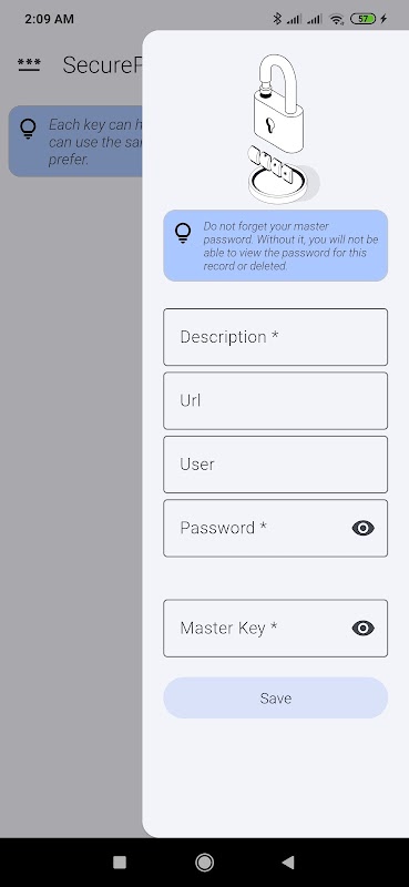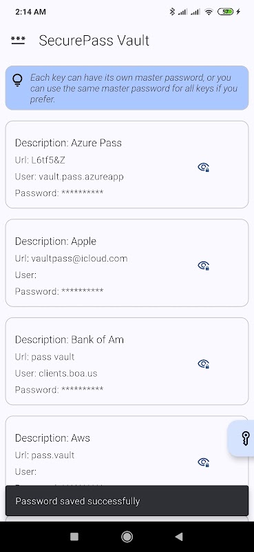 Master Password: A single master password to access all your passwords. Do not store this password on the device for enhanced security.