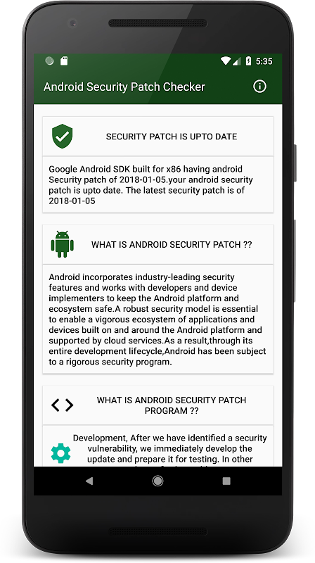 This application will let you know about your security patch is up to date or not it will help you to get the latest android security patch check.we are checking patch directly from the google latest security patch update of every months.The google is releasing the security patch every month and we are fetching direct patch details from their directory and on that basis checker will let you know.!