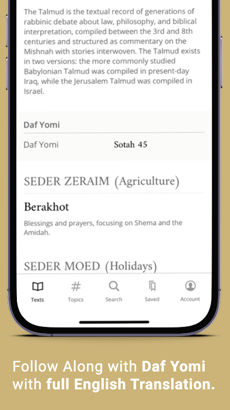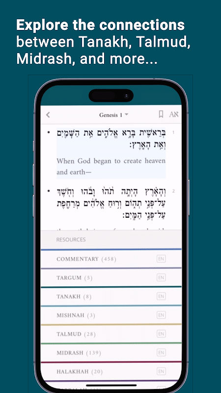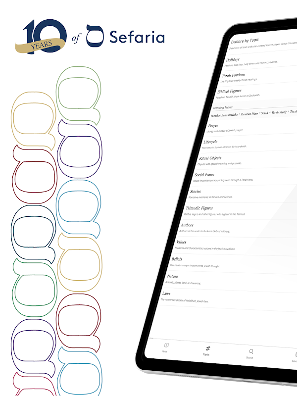 Sefaria delivers 3,000 years of Jewish texts (Torah, Tanakh, Mishnah, Talmud, and more) to your smartphone. All texts in the library are available in Hebrew along with a growing body of English translations. Search by keyword or browse the table of contents to explore texts, translations, and commentaries. Plus - the entire library can fit on your phone (500MB) so you can learn while you're offline.