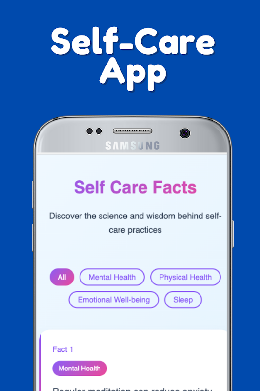 Take time for yourself with the Self-Care App! Learn valuable self-care facts to improve your mental, emotional, and physical well-being. Experience guided meditation sessions designed to help you relax, reduce stress, and cultivate mindfulness. Whether you need a moment of calm or want to build healthier habits, this app is your perfect self-care companion.