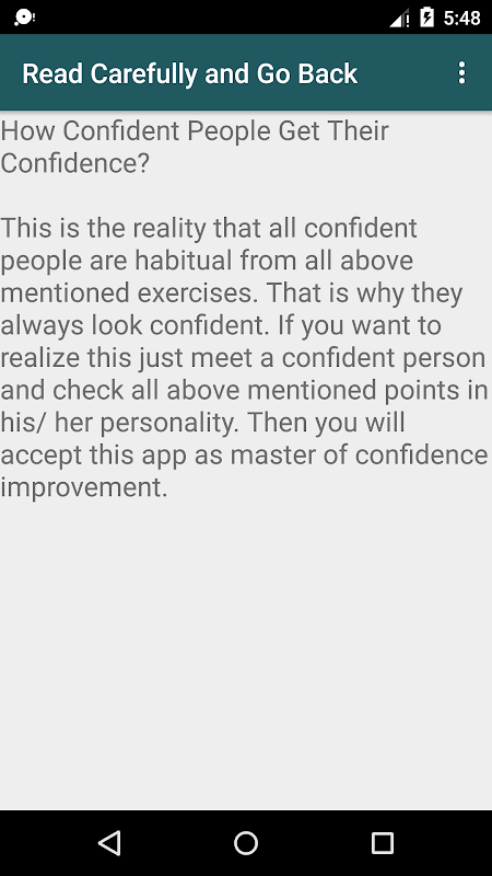 Next updates in confidence building app coming very soon with most interesting updates for study and quick practices. Confidence Building Self Esteem Free exercises for download are also coming soon.