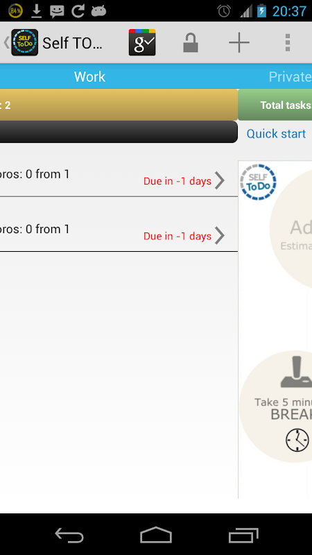 Self TODO allows add task or import it from Google Tasks, estimate it and track work progress. And that's it. Plan, prioritize, control execution, focus and check the value.