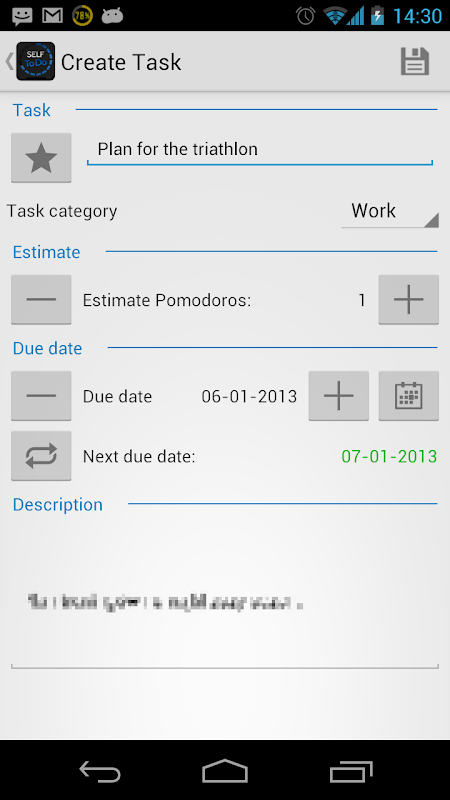 - Managing tasks: title, description, estimation in pomodoros, category, due date, priority, group tasks by category