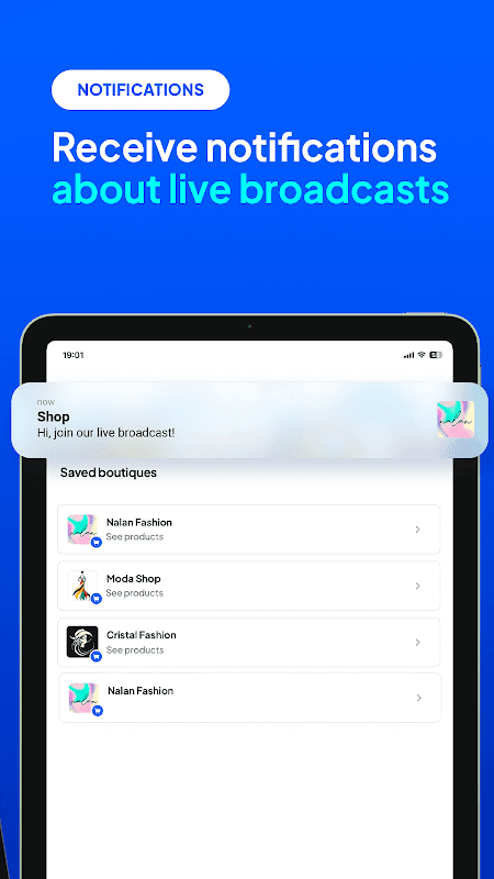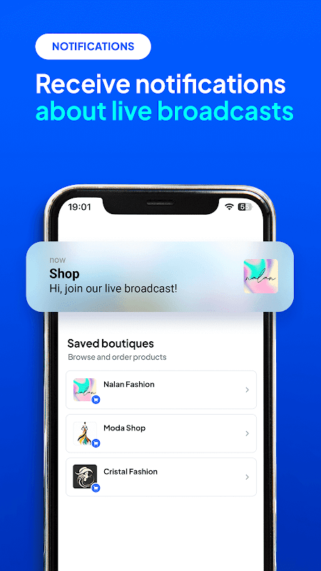 Receive instant updates about upcoming live streams and new products from the boutiques you follow. Stay up-to-date with notifications tailored to your preferences.