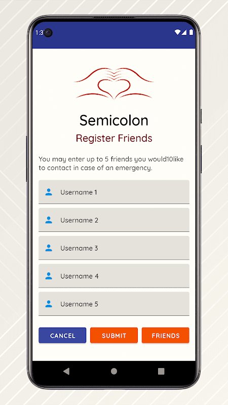 Semicolon is designed for people with mental health issues, sometimes it is hard to pick up the phone and call a friend when you are feeling down and ask for support, this app is designed as an easy way to seek support from friends. Download this application and sign-up. Following this pre-program up to five other friends who also the application. When you are feeling unsafe to yourself; or in times of distress when you need to talk to a friend, simply press the red "Help" button, you're friends will receive a notification on their phone with you're name and mobile phone number so they can call and support you.