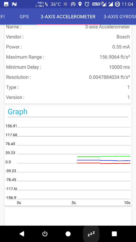 This application shows you the output of all sensors of your Android device, like accelerometer, magnetic field sensor, light sensor and a lot more, including their resolution, maximum range and power consumption.