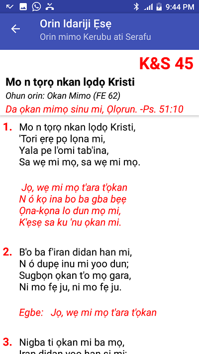 The seraph hymn comes with the full hymns as contained in the hymn book with good look and feel, category of all hymns and easy search feature. Hymns has become mobile for mobile worship and meditation.