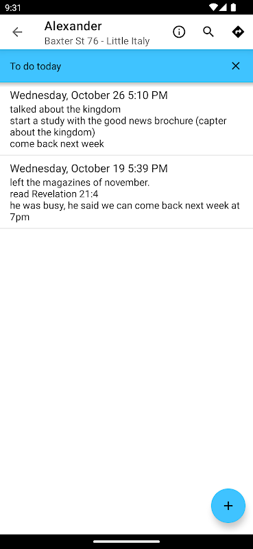 • Service sessions management: you can quickly open and modify the current day report to add visits/magazines/tracts/...