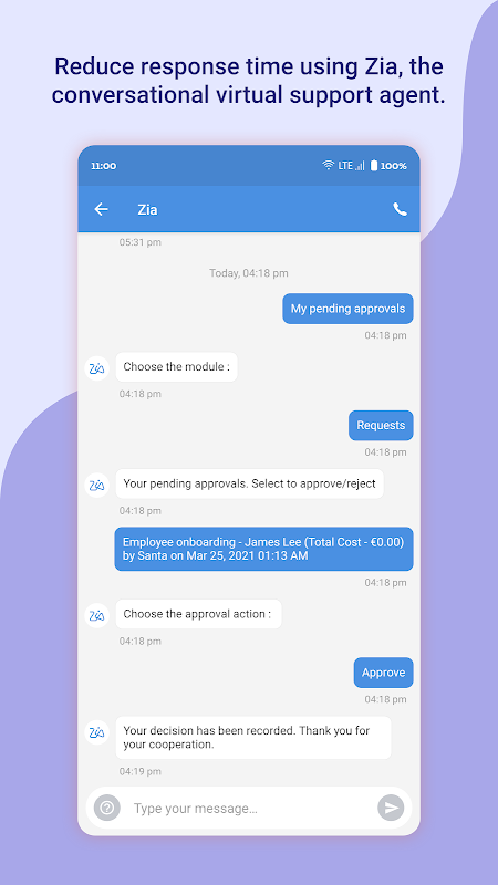 AI-powered smart assistant: Connect with Zia for instant support through conversational chat or voice commands.