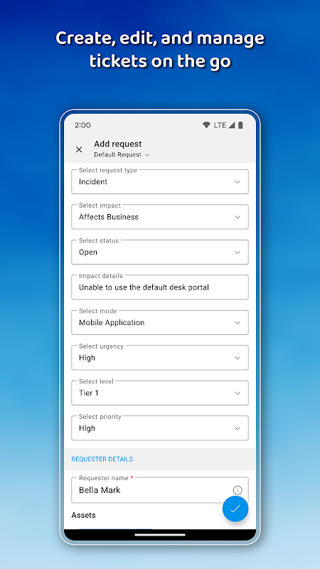 - Rapid request handling: Create, pick up, assign, merge, resolve, and close IT tickets on the go.