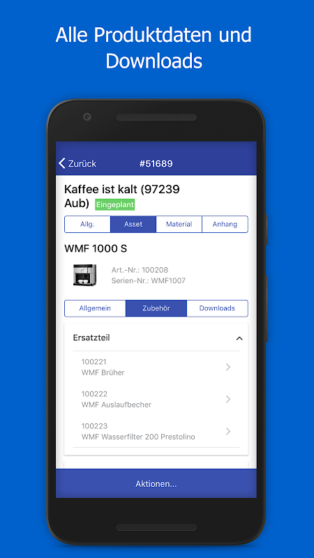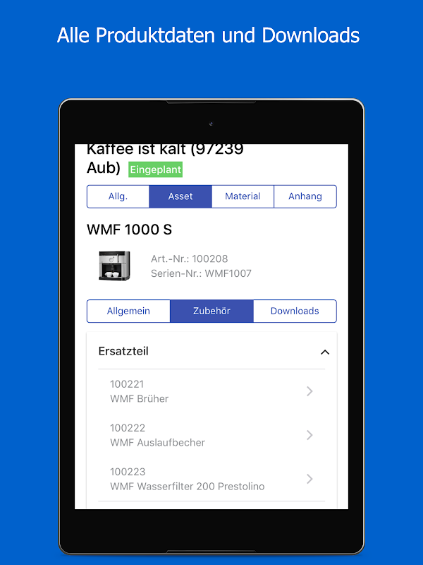 Produktdaten und -eigenschaften, Bilder, Explosionszeichnung oder Beschreibungen von Ersatzteilen können direkt in der App abgerufen werden.