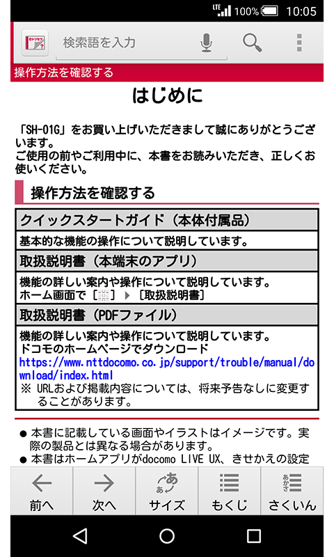 「SH-01G」の取扱説明書として閲覧できるだけでなく、一部の機能については説明文から端末設定などを直接起動することができますので、SH-01Gをより便利にお使い頂けます。