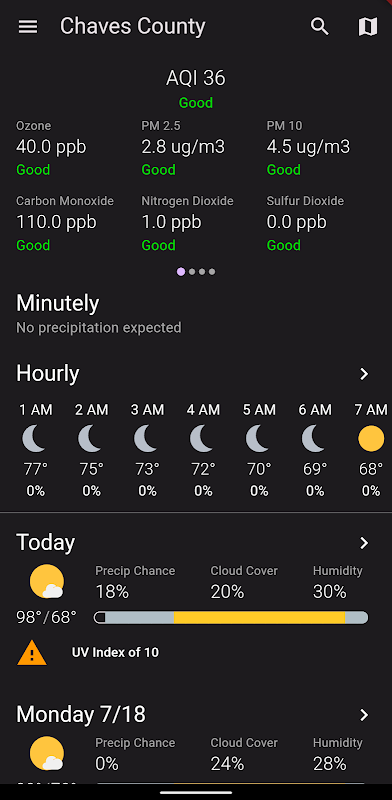 Here are some of the features: daily forecast, hourly forecast, minutely forecasts, weather alerts, air quality, interactive radar, storm tracker, and more!