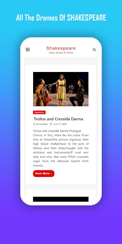 If you are searching for Shakespeare drama in English, this new app is here to help. You will find Shakespeare drama, novels, poems, and comedy writings.
