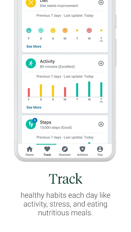 • Keep track of your daily health and wellness goals, including weight, sleep, stress, activity levels, fitness, diet and blood pressure