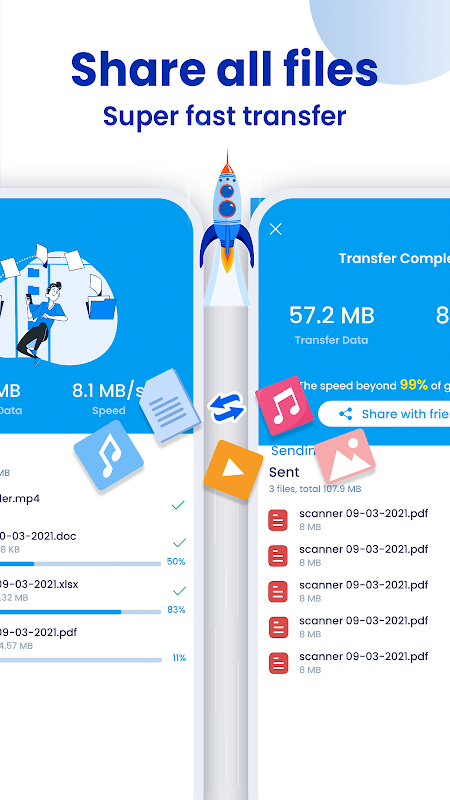 ShareFileFast - Share File & File Transfer satisfies all your transfer needs perfectly. Just select videos, photos, music, contacts, apps & e-book, pdf files or anything, it will stably transfer them to your friends at a lightning speed, even without the network.