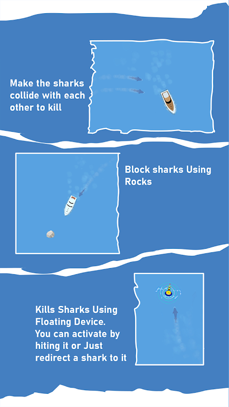 Control Your Boat using simple on-screen controls, Make the Sharks collide with each other to Kill sharks Increase score & Survive as long as possible.