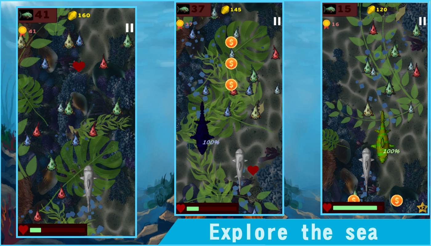 Try to be a shark in different locations, fight against other sharks and eat all the fishes. Scroll finger to move your shark and eat all fishes in your way. Collect coins and other items like hearts and stars. Use collected coins to buy new sharks, the more shark cost - the more powerful it is. Set high records by eating fish and defeating other sharks so you will be able to open new maps. There are a lot of different and cool maps where you can try to survive.