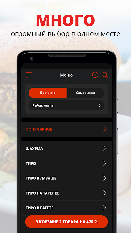 In our application, you can place an order for the delivery of shawarma, gyro, pizza, burritos, sandwiches, burgers, salads, side dishes, pastries, cocktails and coffee.