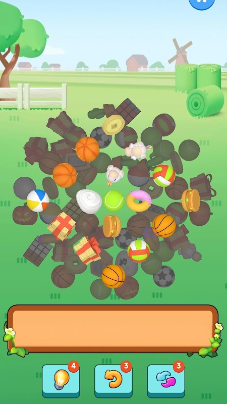 Players need to eliminate 3 identical patterns in the card slots, a total of 7 slots. If failed, they can watch an advertisement to revive or challenge again.When players click on the elements above the game, the elements will move down to the frame at the bottom. A total of 7 cards can be stored in the frame. When there are 3 identical cards, they will be eliminated. For example, three identical buckets can achieve elimination. When there are no cards that can achieve 3 eliminations on the scene, players can observe the cards on the lower layer that are temporarily unavailable. After clicking on the upper card, the card below can be used.