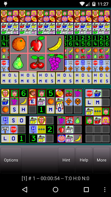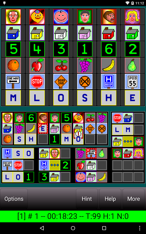Sherlock is a computerized version of logic puzzles, where you're presented with a series of clues that help you to determine the exact locations of all of the images on the playing board. The puzzles are all 4x4, 5x5 or 6x6. Each row of the playing board contains images of the same type (faces, houses, numbers, fruit, street signs, letters, etc). The game scrambles the locations of the items in each row (without showing you their locations) and then presents to you a set of graphical clues that describe the positional relationships of different images. You use the clues to deduce where things can't be (and where they HAVE to be) until you know where all of the images are located.