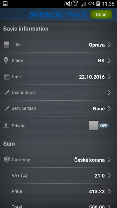 - Expenses - This module lists the expenses of fuel and other costs of single vehicles with a possibility creating them