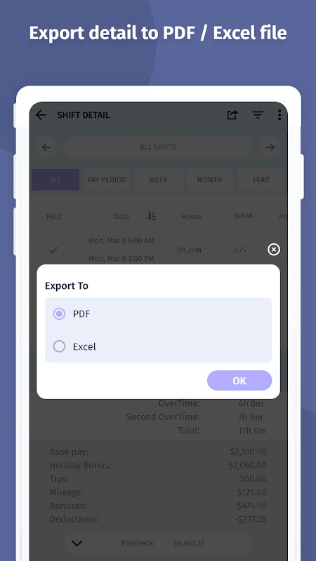 Generate timesheet reports in PDF or Excel. Ideal for payroll, HR, or personal finance tracking.