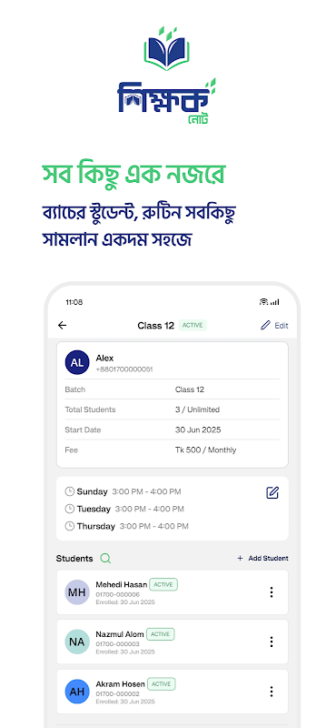 📲 Class Notifications: Students receive notifications on their phones according to the class schedule and routine.