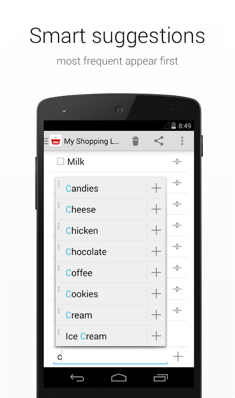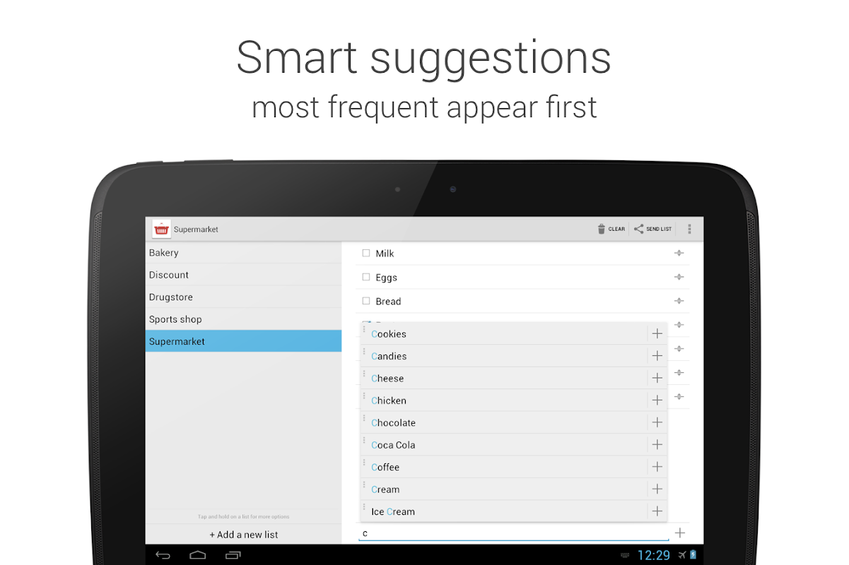 As you start typing a product, Shopping List shows up suggestions that you can add very fast to the your shopping list. It comes with a bunch of popular suggestions for you to start with. All products you enter in your shopping cart will later be available as suggestions so that you will save time when preparing your shopping list. Add multiple shopping lists to keep products you will buy in different stores separated.