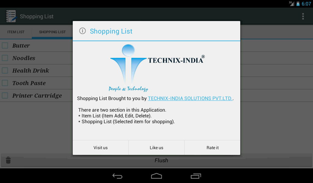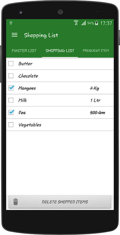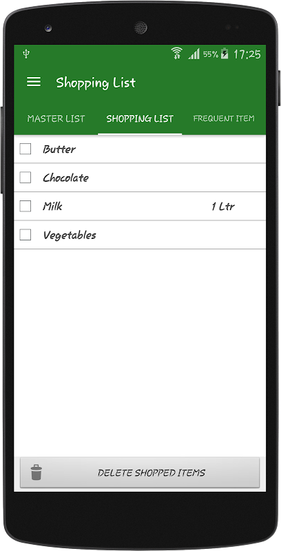 While shopping, you will be on the Shopping List tab and you will see only those items that you selected from the Item List. As soon as you place an item in your shopping basket/kart/trolley you can tap on that item and the item gets stroked off, denoting you have already picked up that item and placed it in your bag/kart.
