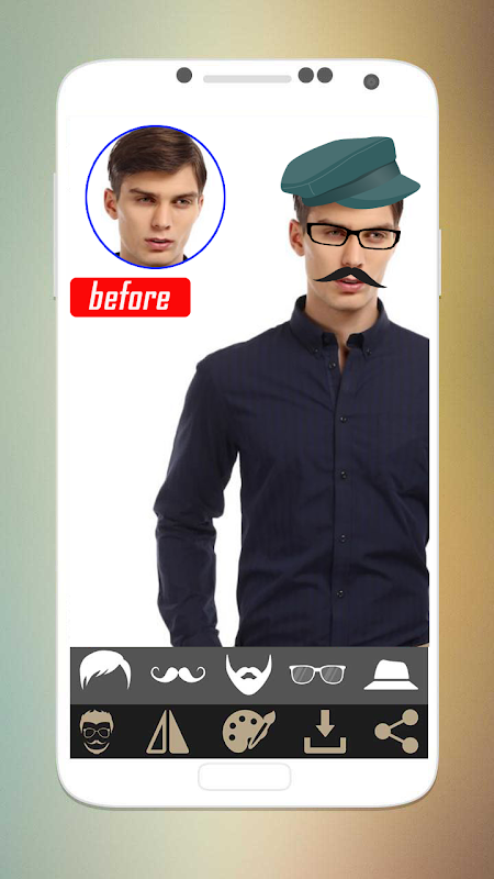 You can choose a photo from the gallery or take a photo with the camera, Create amazing pictures using various of hairstyles, cap, mustache styles,glasses and beard styles. You can easly change hair,mustache and beard colour, Share – allow the user to share your app with friends.