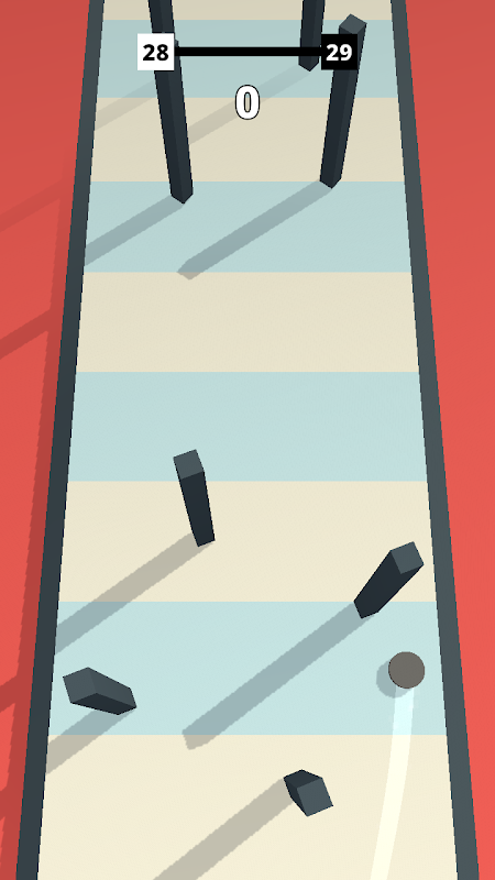 The ball is going left and right continuously. Tapping and Holding make the ball move forward. Dodge as many obstacles as you can!