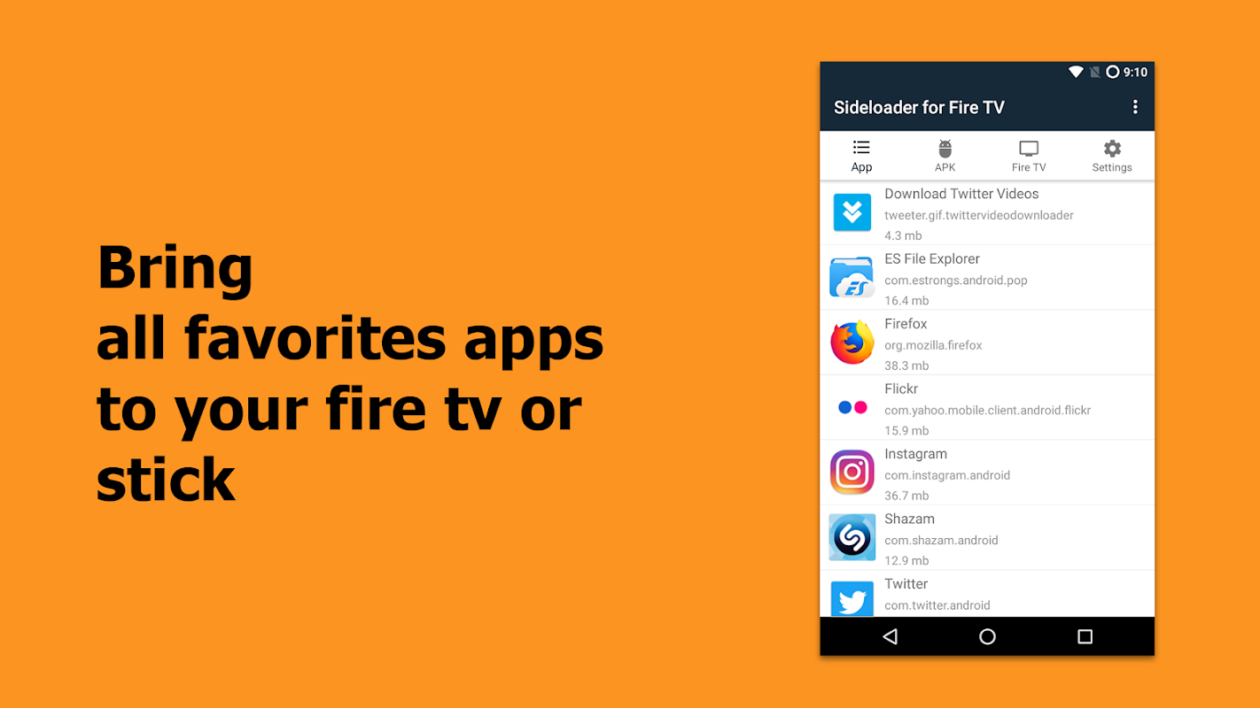 With Sideloader for Fire TV app, you can install any apps that you want to Amazon Fire TV or Stick, launch and manage them right from your phone or tablet.