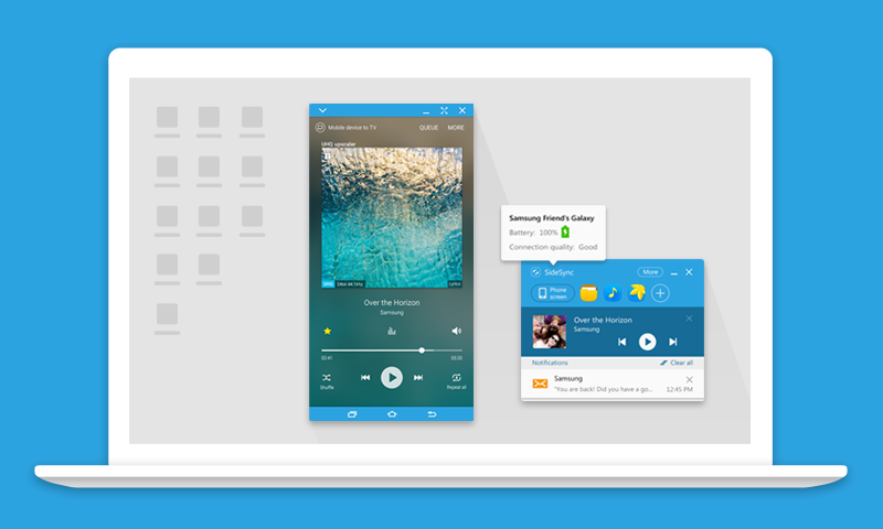 SideSync is a new PC-Mobile solution that enables screens, windows, and data to be shared easily. Share between a PC and a Galaxy smartphone, or between a Galaxy Tab and Galaxy smartphone.