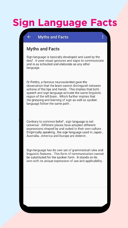 Sign language for beginners also includes a brief history , certain facts and myths about sign language . It includes quick links to an add free Pro version .